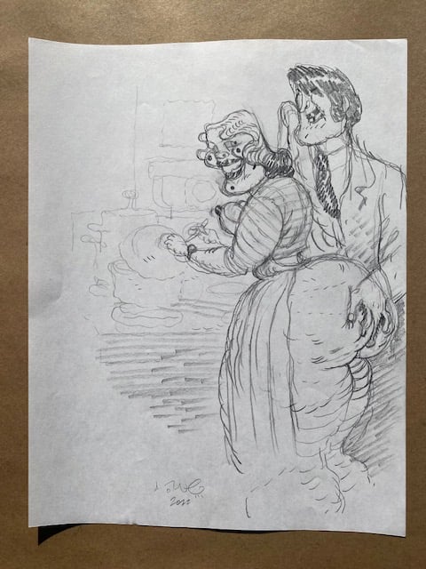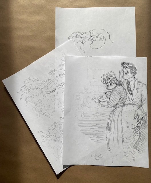 One selection from an on-going body of work- roughs drawn while fleshing out a project, aimless sketching to come up with new ideas, and warm-up doodles drawn from photographs.