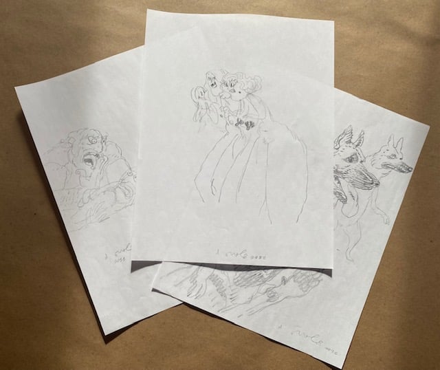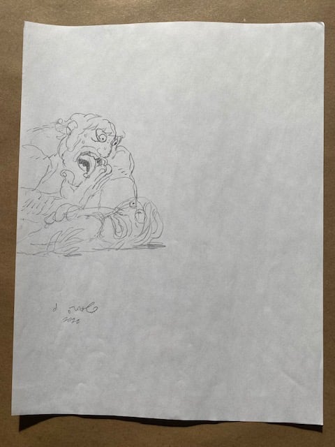 One selection from an on-going body of work- roughs drawn while fleshing out a project, aimless sketching to come up with new ideas, and warm-up doodles drawn from photographs.