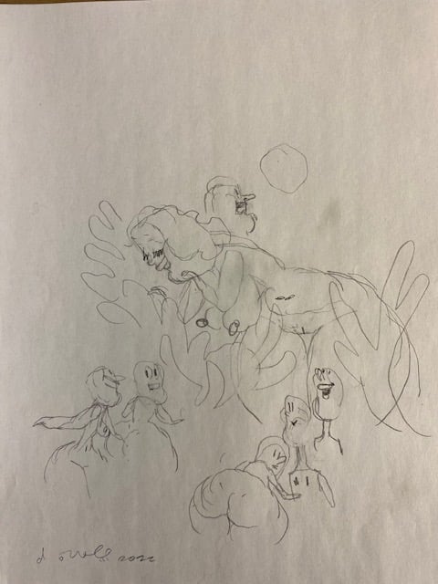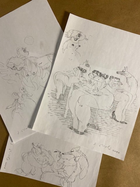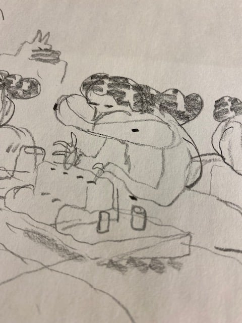 One selection from an on-going body of work- roughs drawn while fleshing out a project, aimless sketching to come up with new ideas, and warm-up doodles drawn from photographs.