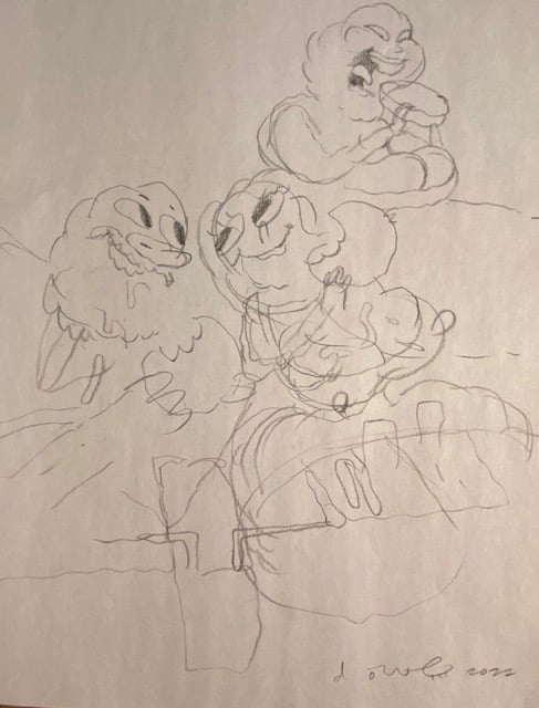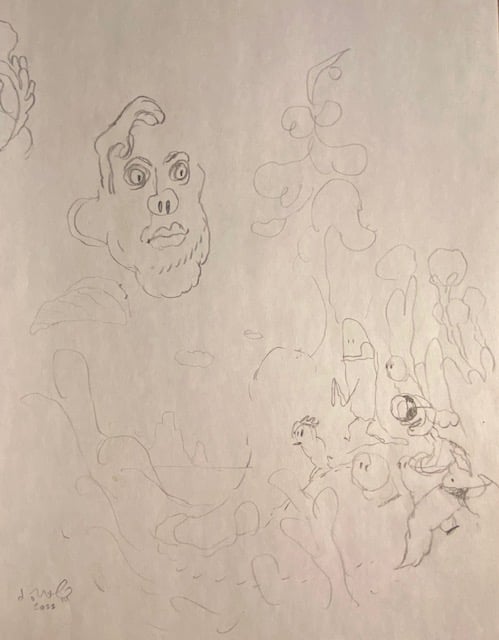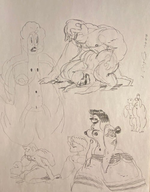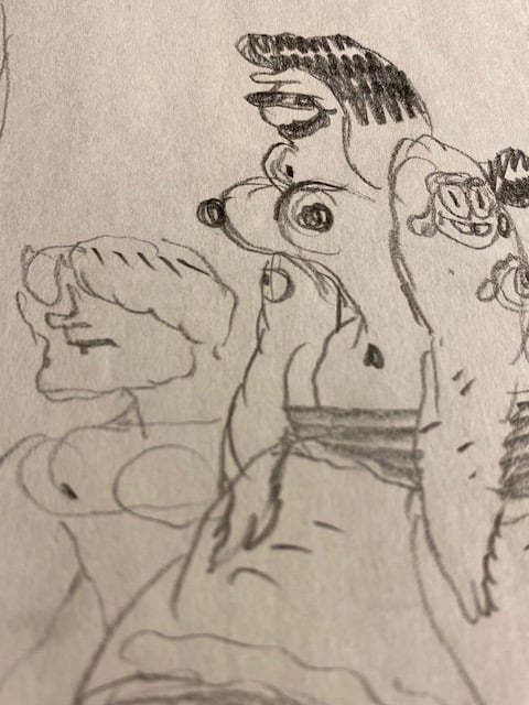 One selection from an on-going body of work- roughs drawn while fleshing out a project, aimless sketching to come up with new ideas, and warm-up doodles drawn from photographs.