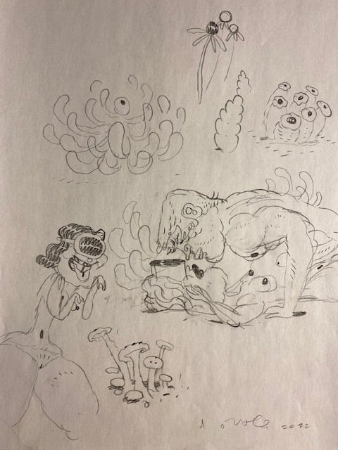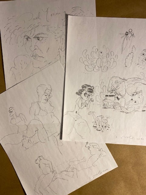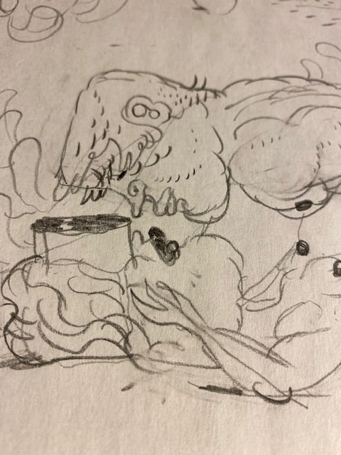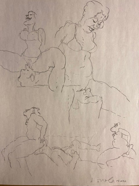 One selection from an on-going body of work- roughs drawn while fleshing out a project, aimless sketching to come up with new ideas, and warm-up doodles drawn from photographs.