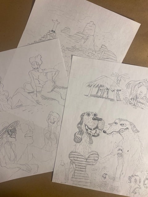 One selection from an on-going body of work- roughs drawn while fleshing out a project, aimless sketching to come up with new ideas, and warm-up doodles drawn from photographs.