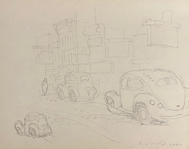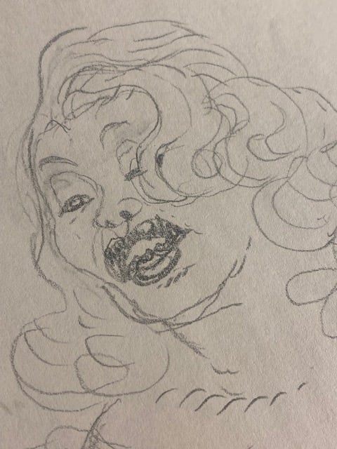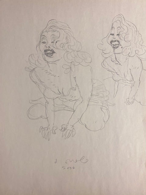 One selection from an on-going body of work- roughs drawn while fleshing out a project, aimless sketching to come up with new ideas, and warm-up doodles drawn from photographs.