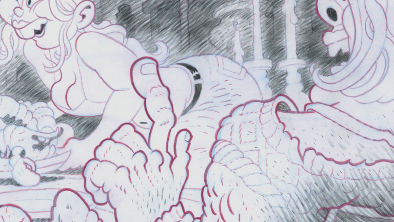 These Line Art pages are the final work that you see in the published book. In the old days they’d be called “inks”. But I don’t use ink for this final stage, I use the same drawing tools that I use for the “pencils” stage, but the result is very different because they’re drawn on a drawing surface called “Yupo paper”. Not paper at all in fact, but polypropylene. Crisper cleaner lines than the pencils. And a bit darker because of the way that Yupo paper receives the strokes and marks.