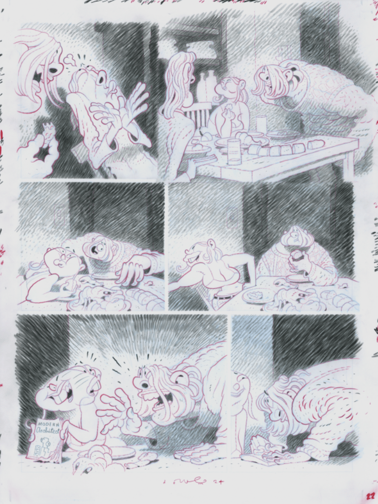 These Line Art pages are the final work that you see in the published book. In the old days they’d be called “inks”. But I don’t use ink for this final stage, I use the same drawing tools that I use for the “pencils” stage, but the result is very different because they’re drawn on a drawing surface called “Yupo paper”. Not paper at all in fact, but polypropylene. Crisper cleaner lines than the pencils. And a bit darker because of the way that Yupo paper receives the strokes and marks.