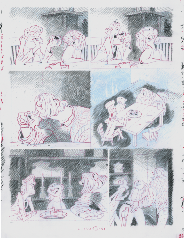 These Line Art pages are the final work that you see in the published book. In the old days they’d be called “inks”. But I don’t use ink for this final stage, I use the same drawing tools that I use for the “pencils” stage, but the result is very different because they’re drawn on a drawing surface called “Yupo paper”. Not paper at all in fact, but polypropylene. Crisper cleaner lines than the pencils. And a bit darker because of the way that Yupo paper receives the strokes and marks.
