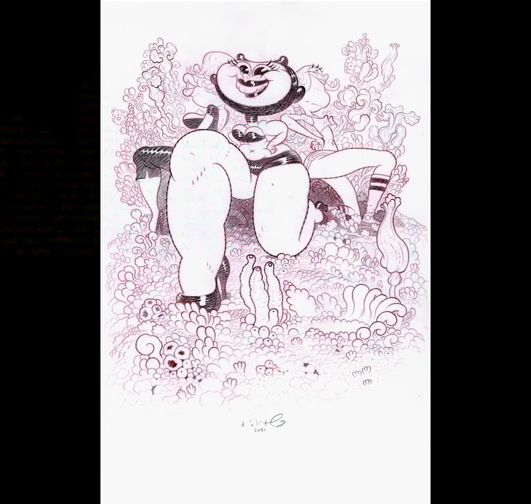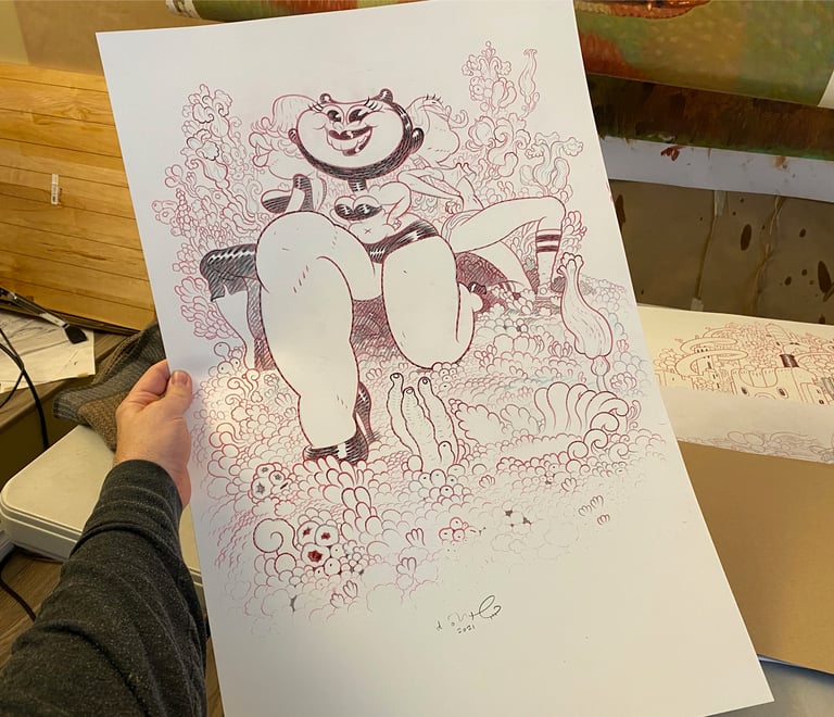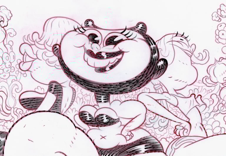 Original large scale drawing for a deluxe fine art print. This commemorates the lucky 13th anniversary of Mimi Wobbly and Friends’ first appearance in the Danko Jones music video, "King of Magazines".
