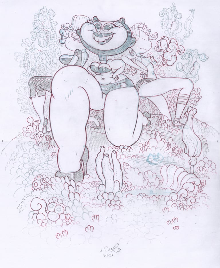 Here is one of the earlier preliminary drawings for my Mimi print. Before going to final linework, I first do a rough on regular printer paper. Using cheap paper is liberating for me, it loosens me up to be more expansive and imaginative. When I’m working on something big (like this piece) I’ll have to work on more than one piece of 11x17” paper taped together.