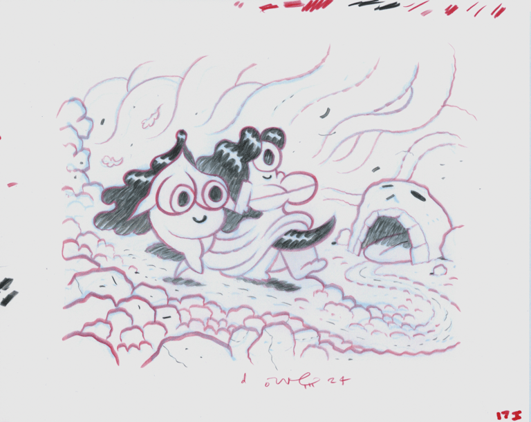 These Line Art pages are the final work that you see in the published book. In the old days they’d be called “inks”. But I don’t use ink for this final stage, I use the same drawing tools that I use for the “pencils” stage, but the result is very different because they’re drawn on a drawing surface called “Yupo paper”. Not paper at all in fact, but polypropylene. Crisper cleaner lines than the pencils. And a bit darker because of the way that Yupo paper receives the strokes and marks.