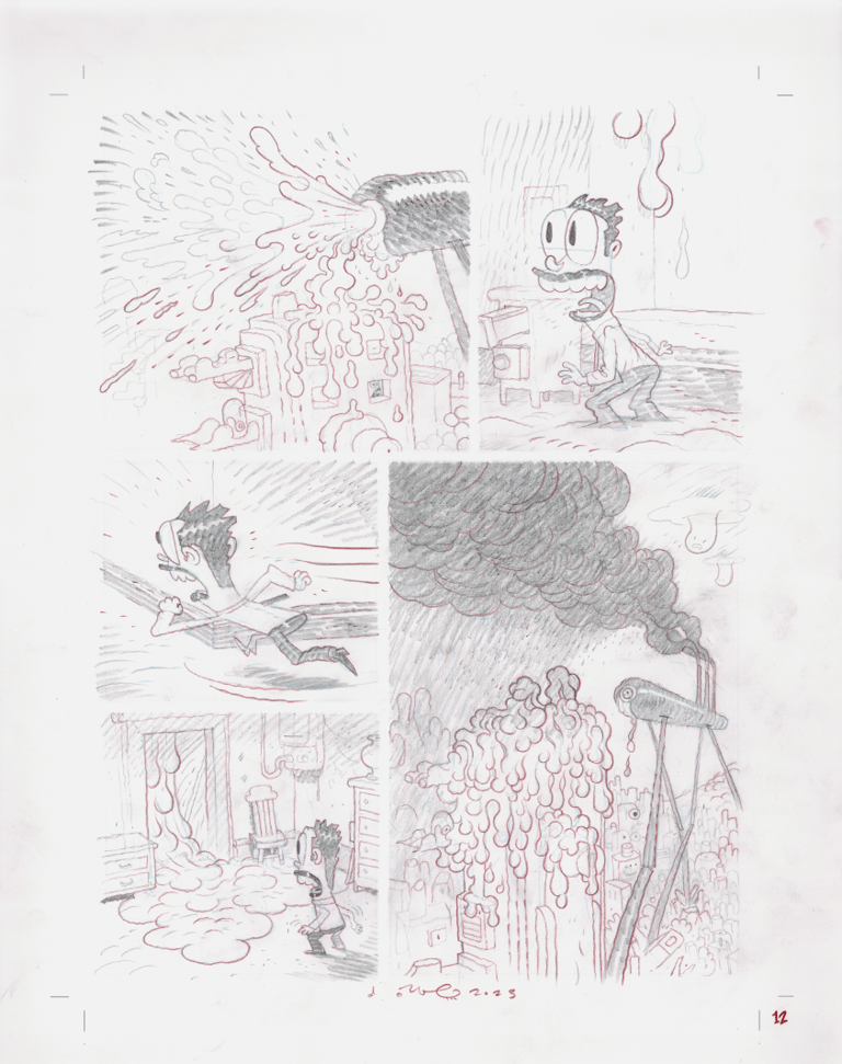These pencilled iterations of comics pages are a very rough preparatory stage where I establish the details, and line flow, but without careful refinement. These are an intermediate stage, I think they have a unique, lively energy.
